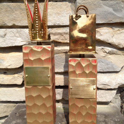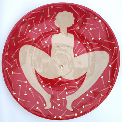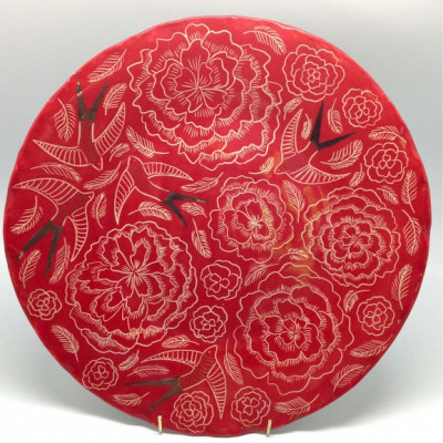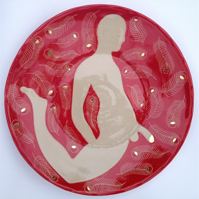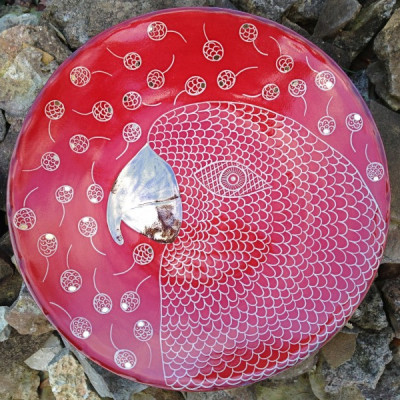 Punane ovaalne väike vaagen kuldsete sulgedega
