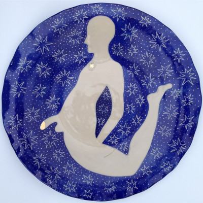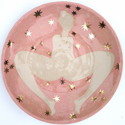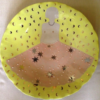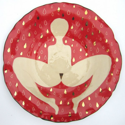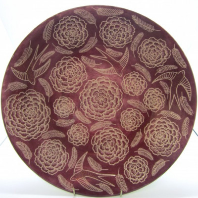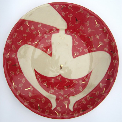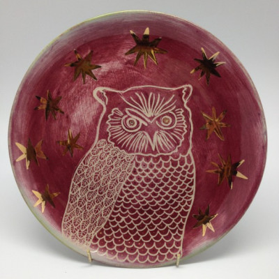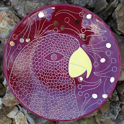 Kirsipunane taldrik linnu ja kuldsete tähtedega