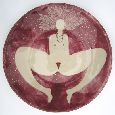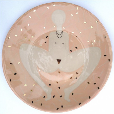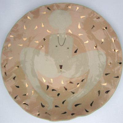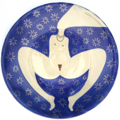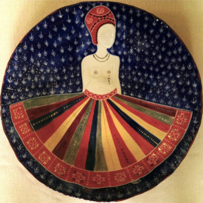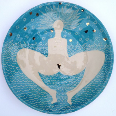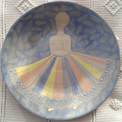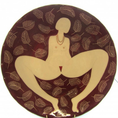 Türkiissinine vaagen naise ja hõlmikpuu lehtedega