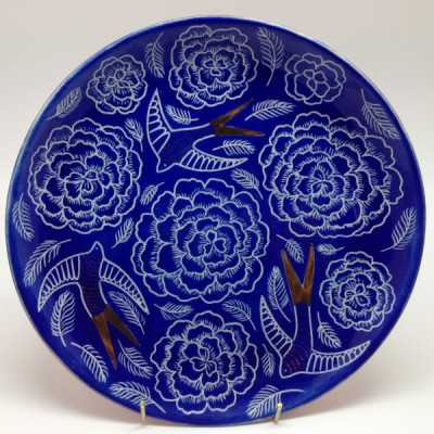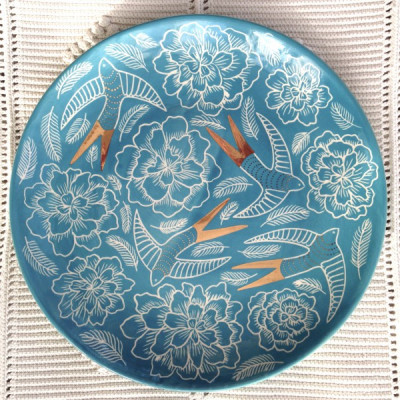 Türkiissinine taldrik pääsukeste, pojengide ja sulgedega