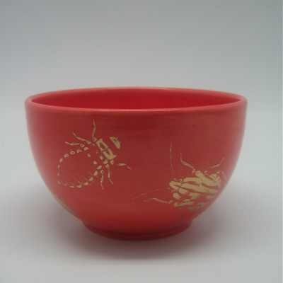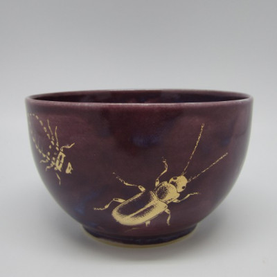 Sõstrapunane kuldsete putukatega kaanega kauss