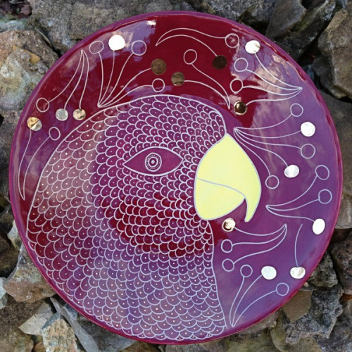 Bordoopunane vaagen kollase nokaga linnuga ja kuldsete kirssidega