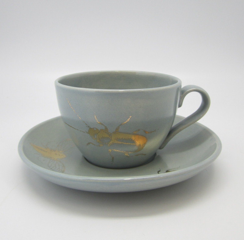 Helesinine tass kuldsete putukate ja alustaldrikuga .