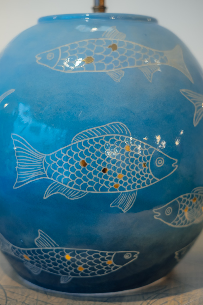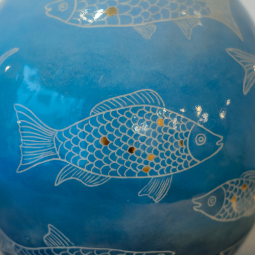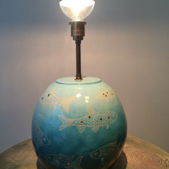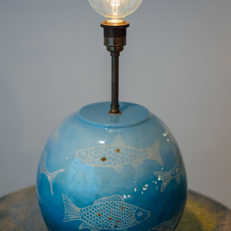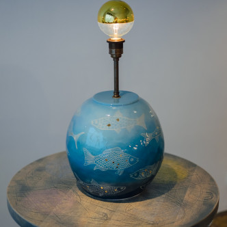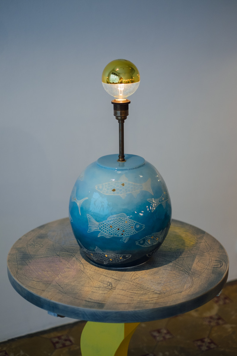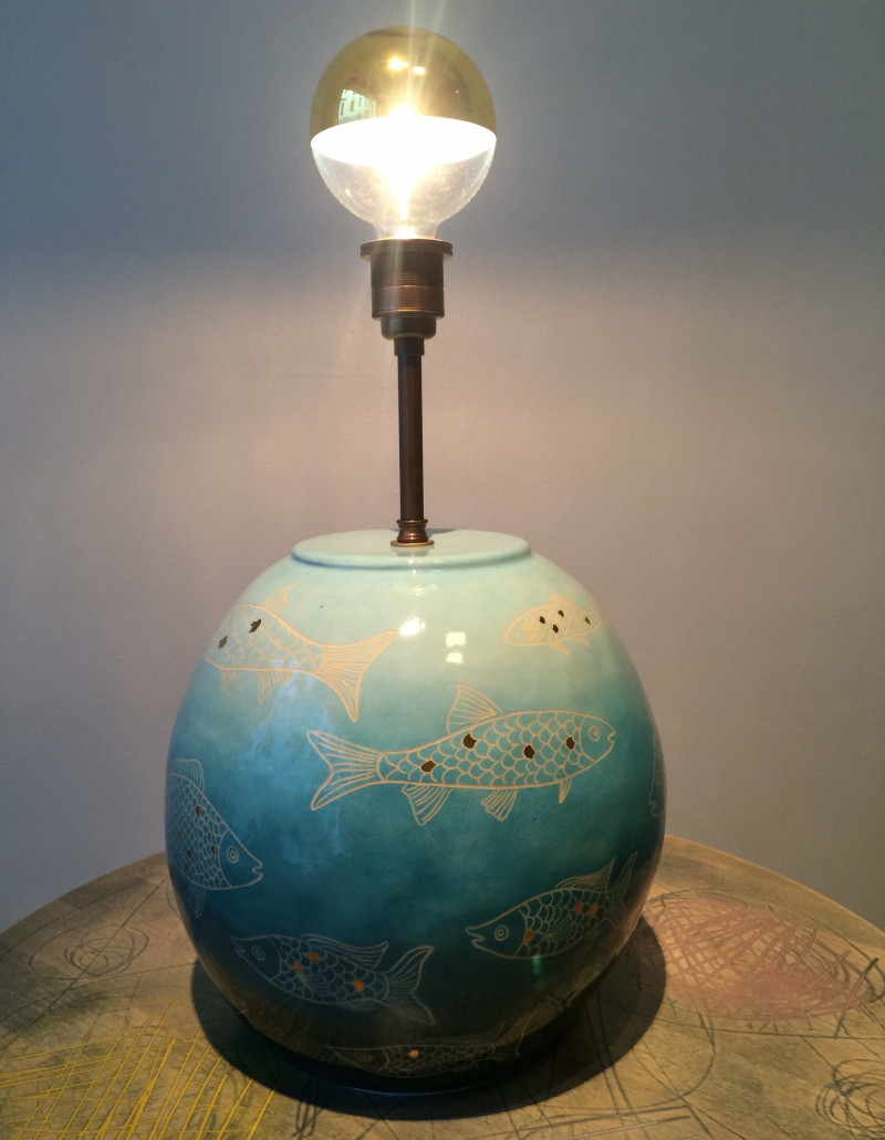 Käsitsi tehtud ainueksemplar, detailid kullaga. Pirn on dimmerdatav halogeen, saab lisada lambivarju, sinepikollane kangasjuhe.