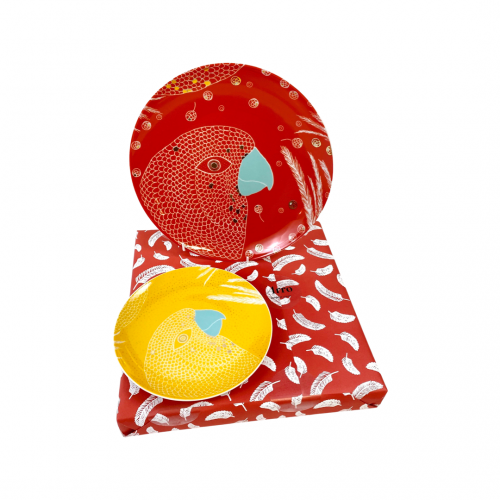 Kinkepakendis on suur punane linnuga taldrik ja väike kollane taldrik. Punane on nagu meie peaaegu küpsed sõstrad ja kollane on nagu päike, mis neid küpsetab. Mõnus soojades, julgetes toonides komplekt. Suur taldrik 28 cm ja väike taldrik 19 cm