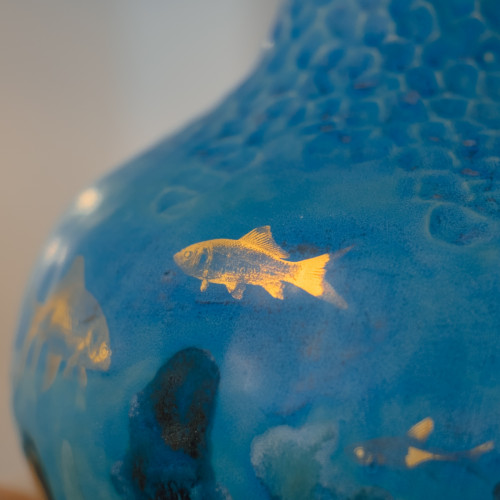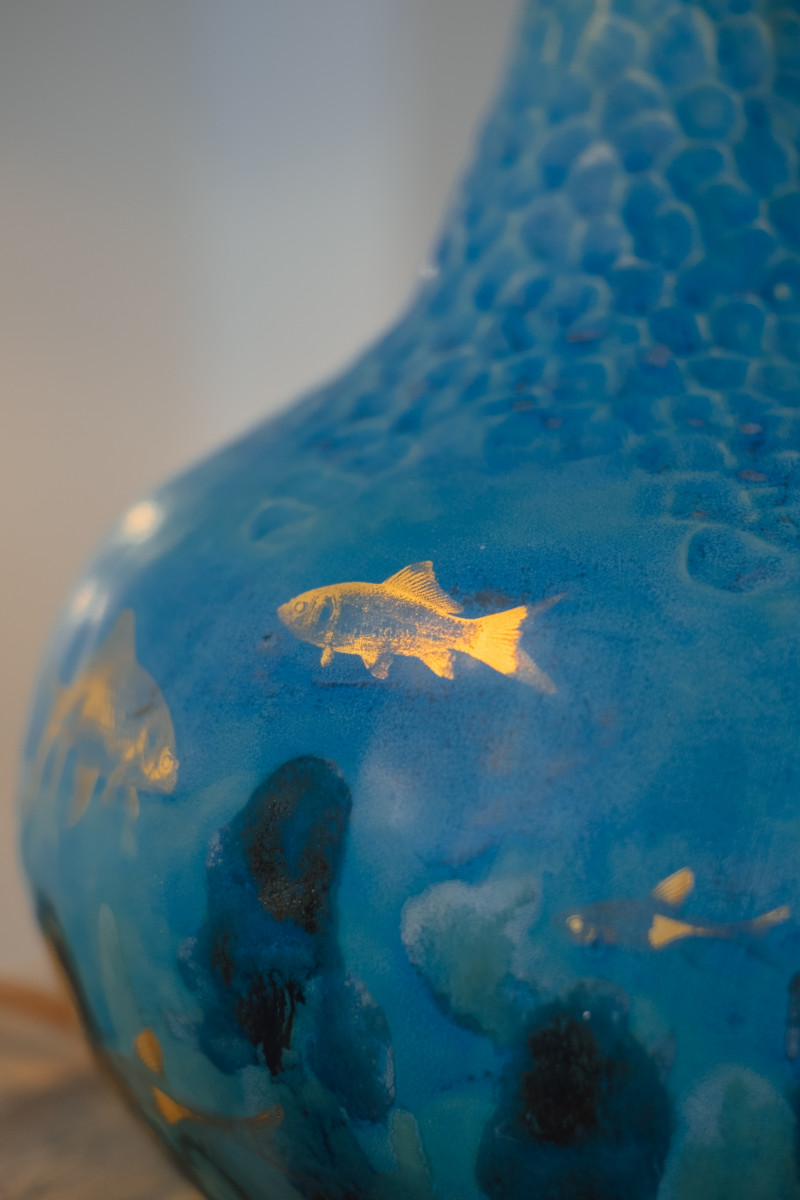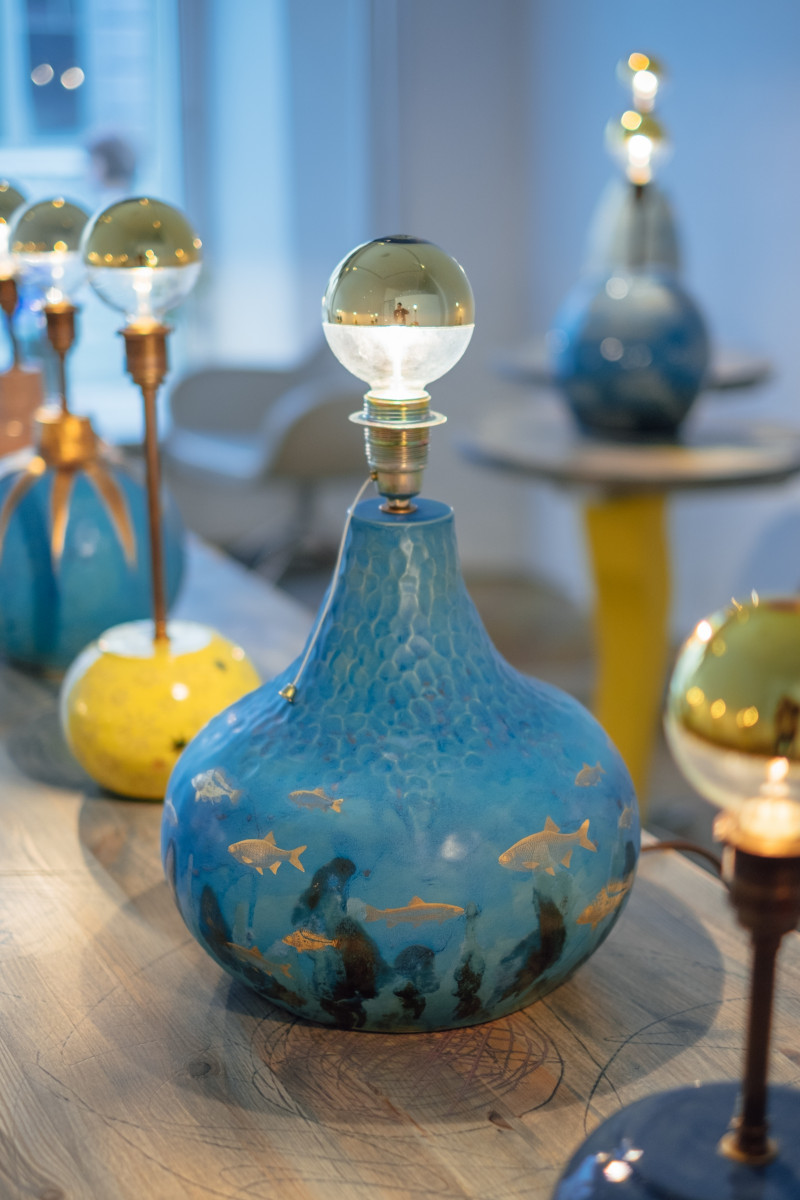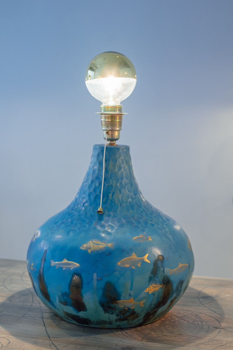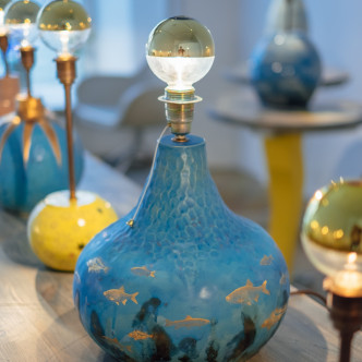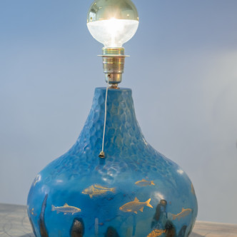 Käsitsi tehtud ainueksemplar, detailid kullaga. Pirn on halogeen, saab lisada lambivarju, kuldpruun kangasjuhe.