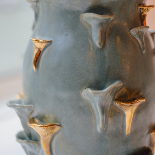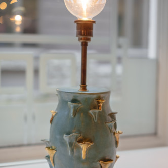 Käsitsi tehtud ainueksemplar, detailid kullaga. Pirn on dimmerdatav halogeen, saab lisada lambivarju, sinepikollane kangasjuhe.