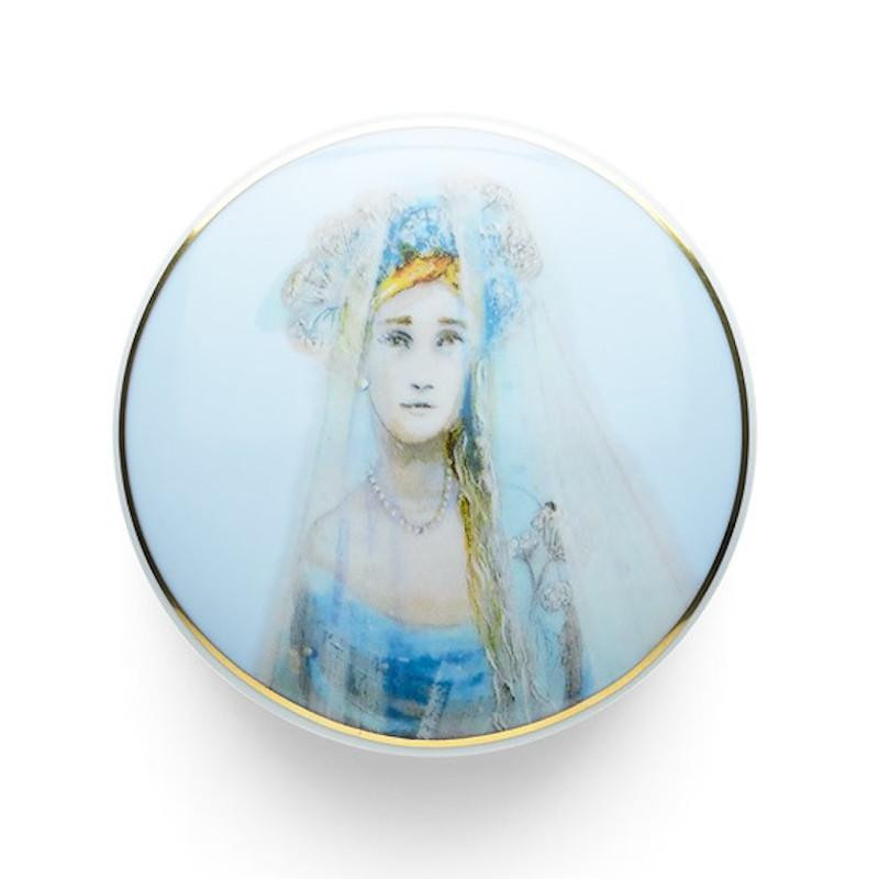 Portselankarbikesel on kujutatud Epp Maria Kokamäe maali “Valge Daam”, mis valmis Haapsalu PiiskopiIinnuse muuseumi tellimusel renoveeritud muuseumi avamiseks.