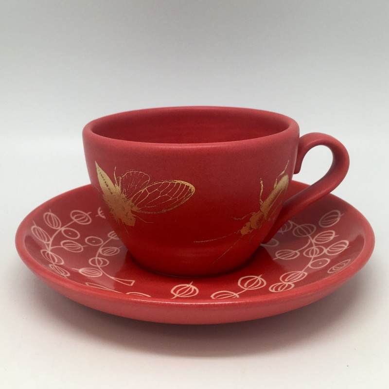 Tass on matt-glasuuriga, alustass sõstardega ja läikiva glasuuriga. Kõrgkuumus, käsitöö, detailid kullaga.