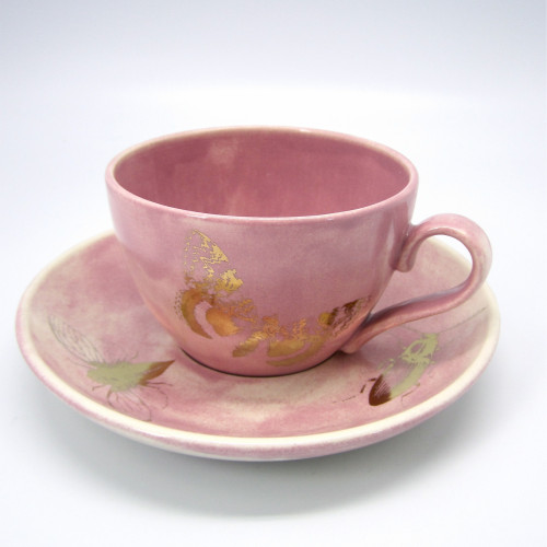 Roosa kuldsete putukatega tass alustaldrikuga.