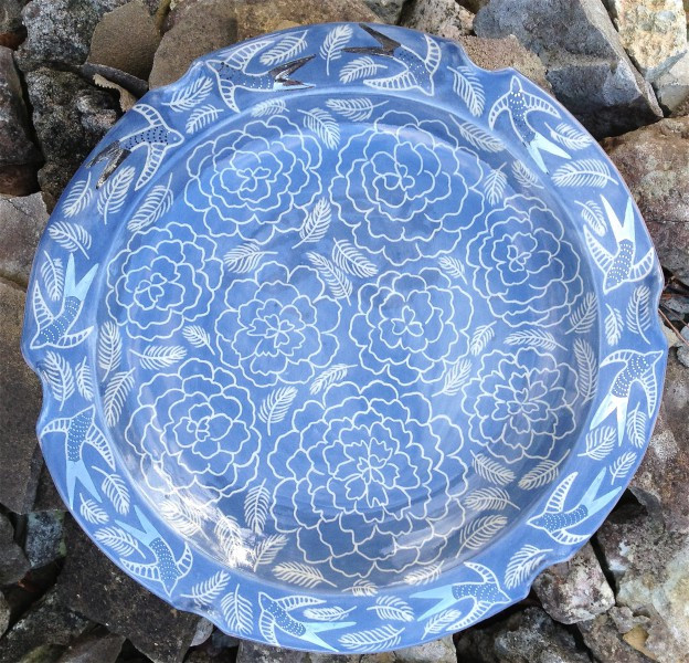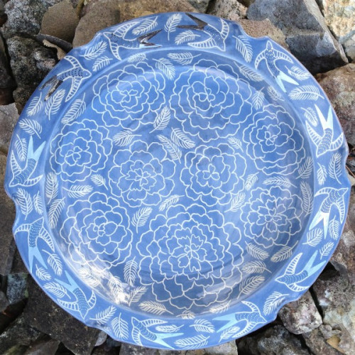 Sinihall vaagen sulgede, pojengide ja lindudega