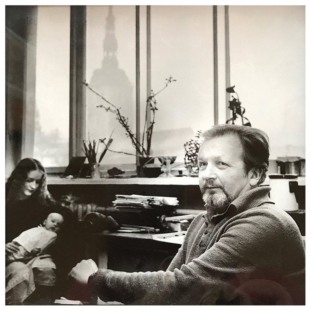 Luulik ateljees tütre Epp Maria Kokamäega, kelle süles on tütretütar Liisu Arro.